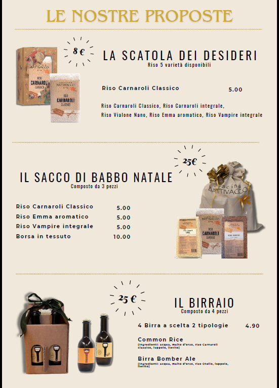 Alla Bottega Cascina Battivacco oltre al Carnaroli bianco e integrale, trovi altre varietà di riso tra cui: il riso vialone nano, il riso Vampire integrale rosso, il riso Emma aromatizzato.